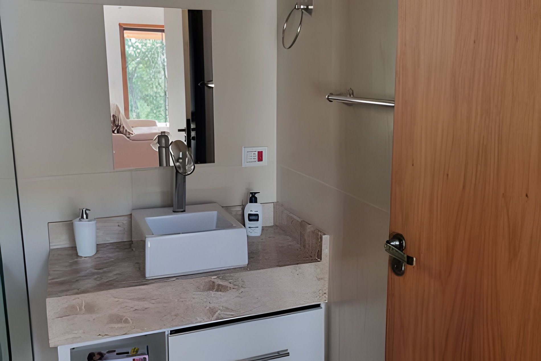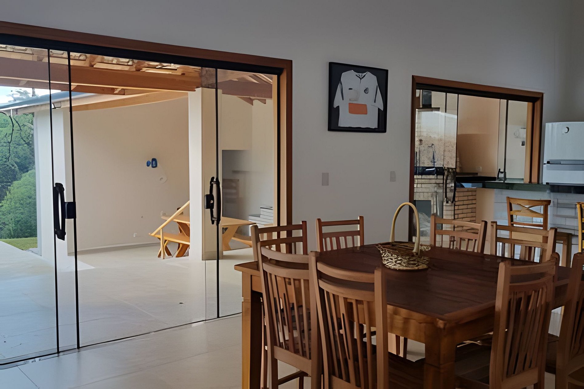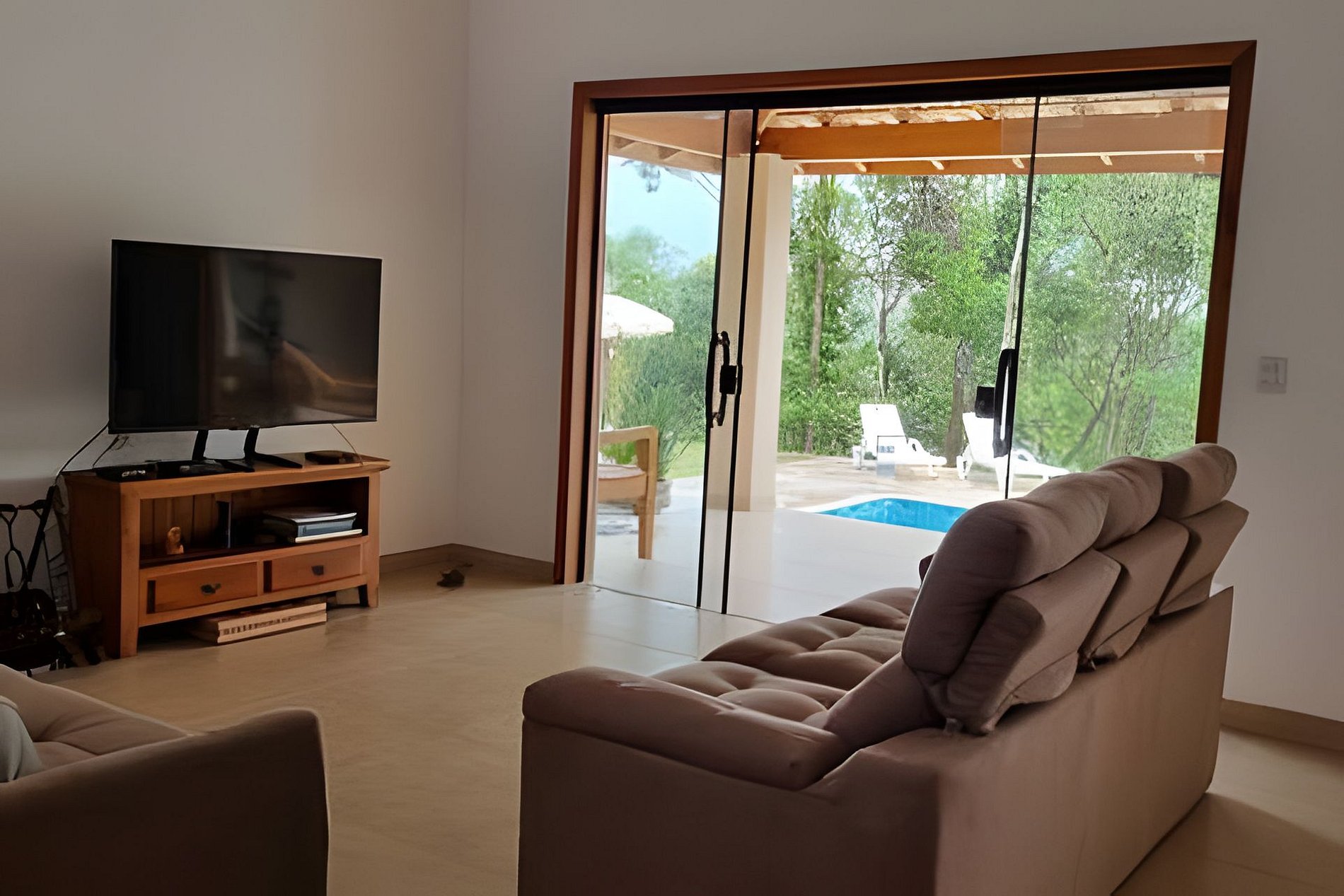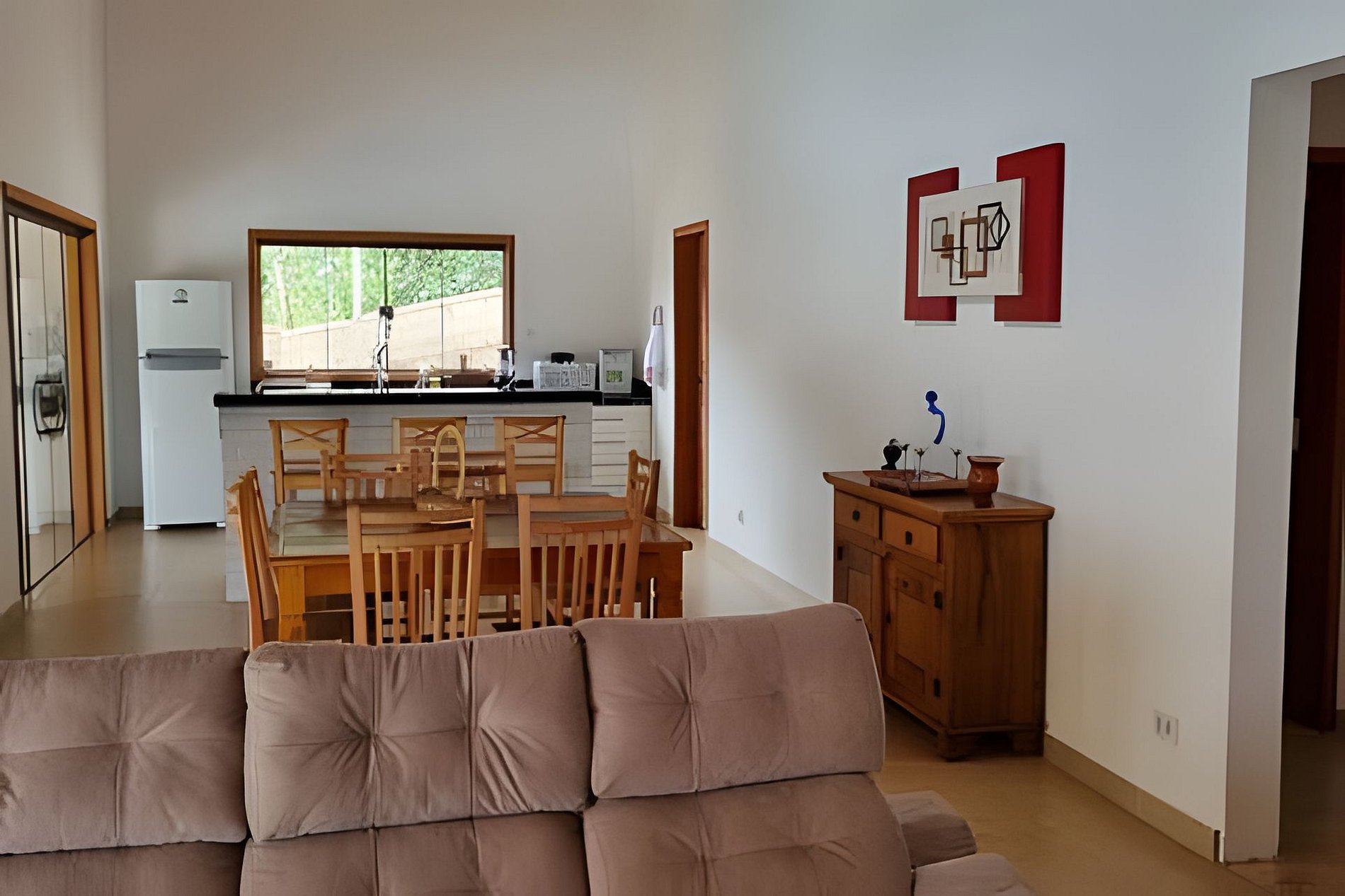 Relaxe com toda a família nesta chácara solar, nova e toda equipada. Localizada na Estância Turística de Ibiúna. Condomínio fechado. Rodeada pela natureza, próximo à represa de Itupararanga. Casa iluminada e arejada comporta 8 pessoas. 1 suíte, 2 quartos, sala com lareira, cozinha, área gourmet completa, churrasqueira, forno de pizza, fogão à lenha. Piscina, gramado e tranquilidade. Portaria 24h, câmeras de segurança e ronda motorizado. A casa oferece roupas de cama, mantas, toalhas e sabonete.