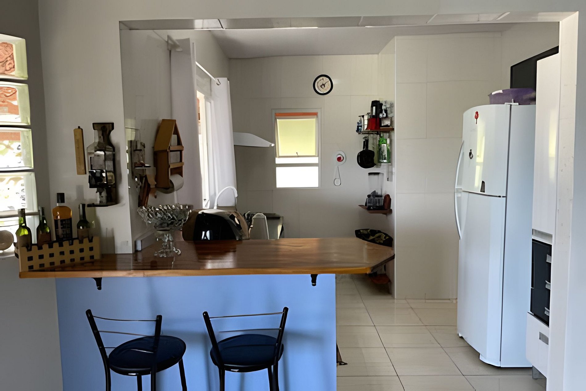 Cozinha equipa com microondas, geladeira, forno, fogão, taças para vinho e espumante