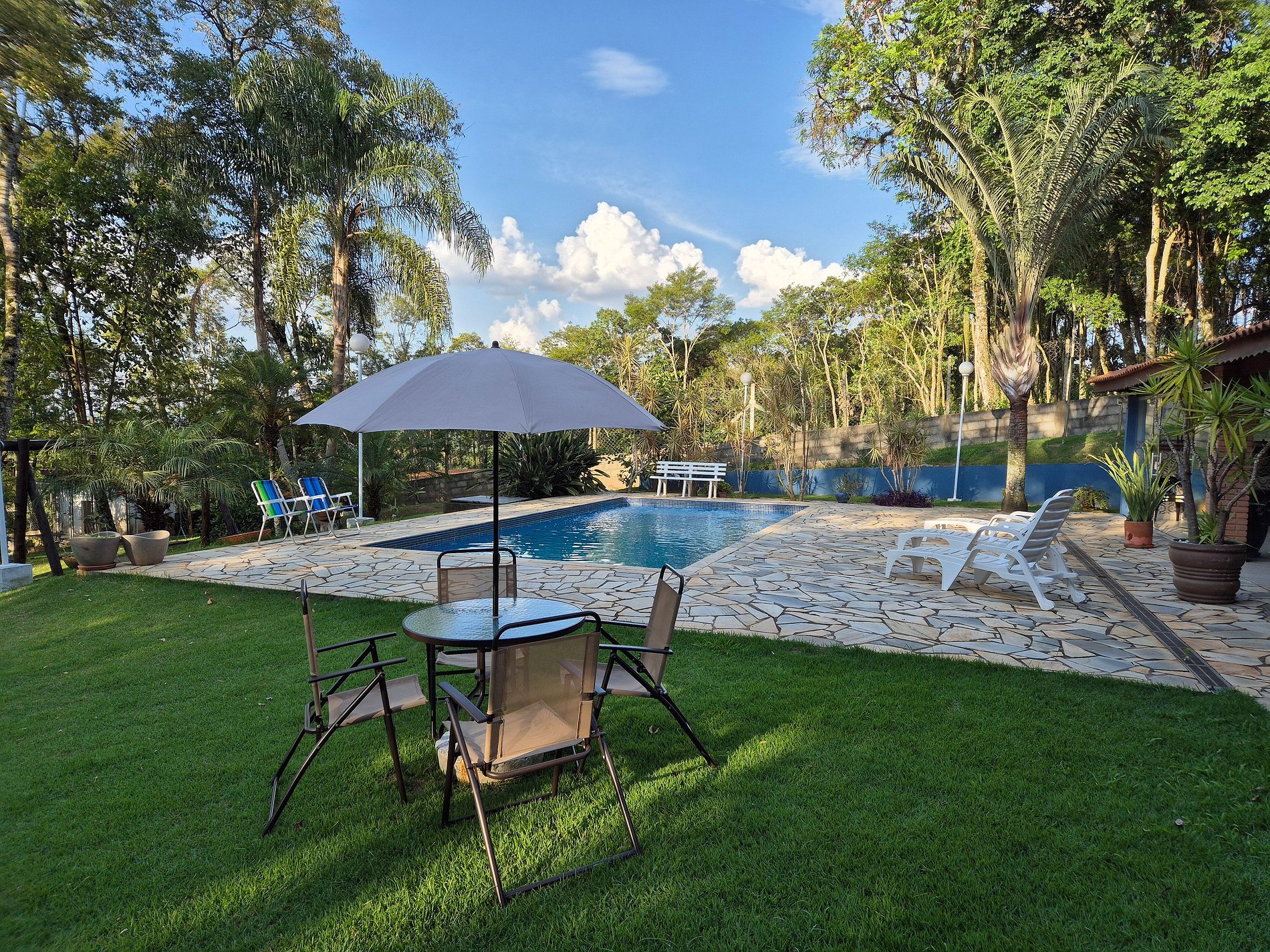JARDIM muito bem cuidado envolve toda a propriedade e você poderá aprecia-lo da varanda da casa e ainda contemplar o céu estrelado ao anoitecer; dar um mergulho em uma piscina climatizada e aproveitar os raios de sol da região e ainda se entregar a um redário em meio às árvores e apenas relaxar ao som dos pássaros que visitam a propriedade. Um espaço para fogo de chão complementa o lazer desta chácara.