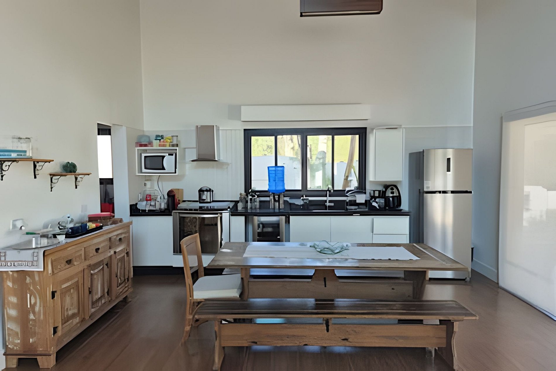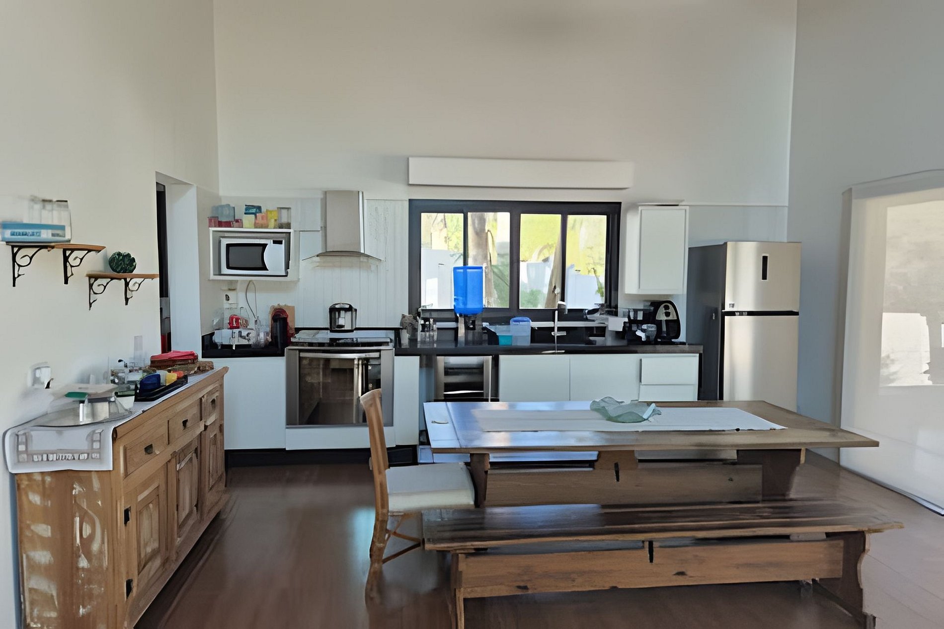 Cozinha integrada e totalmente equipa. Microondas, geladeira, forno, fogão, maquina de lavar louças e todos os utensílios necessários para seu final de semana.