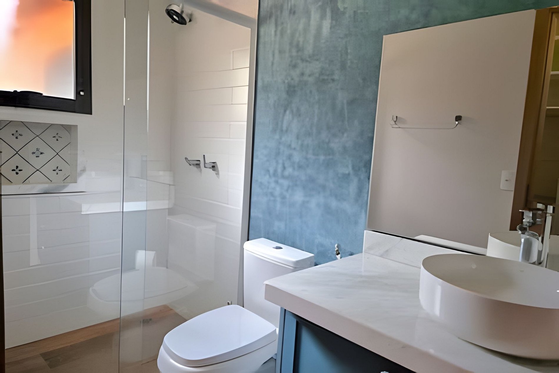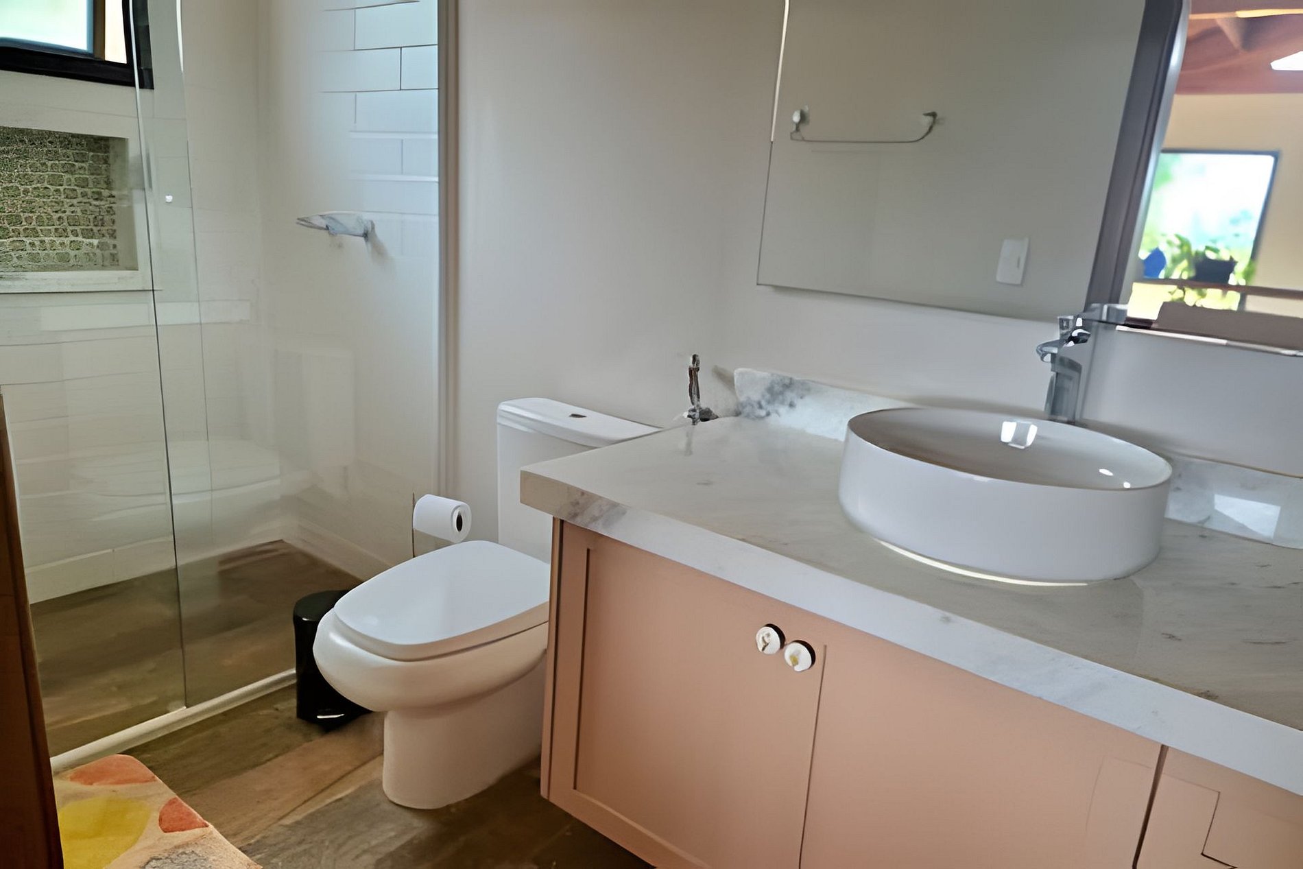 Os banheiros estão abastecidos com sabonete e papel higiênico.
