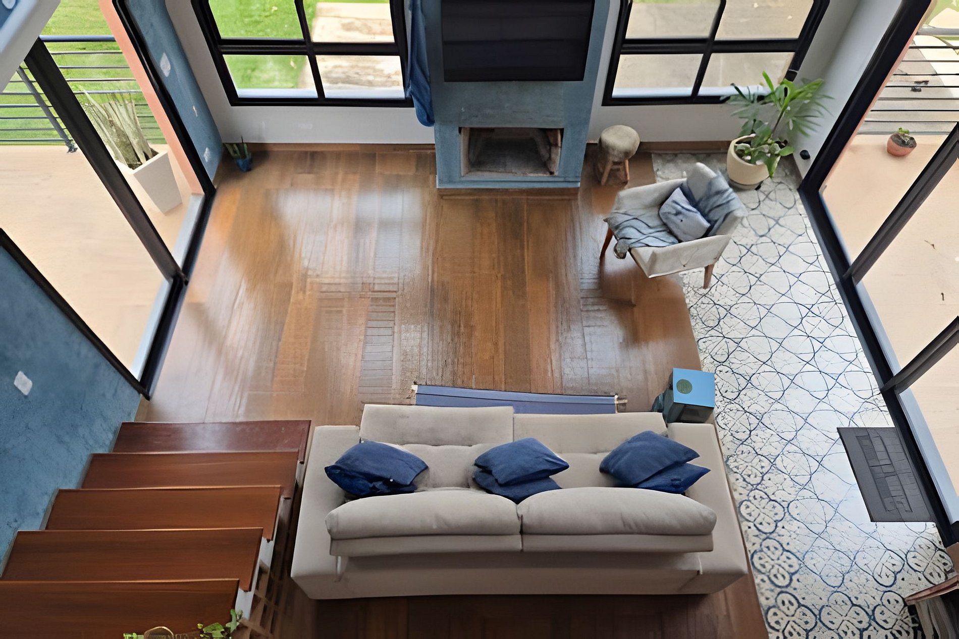 Mezanino com sofá cama, área de trabalho, banheiro e varanda.