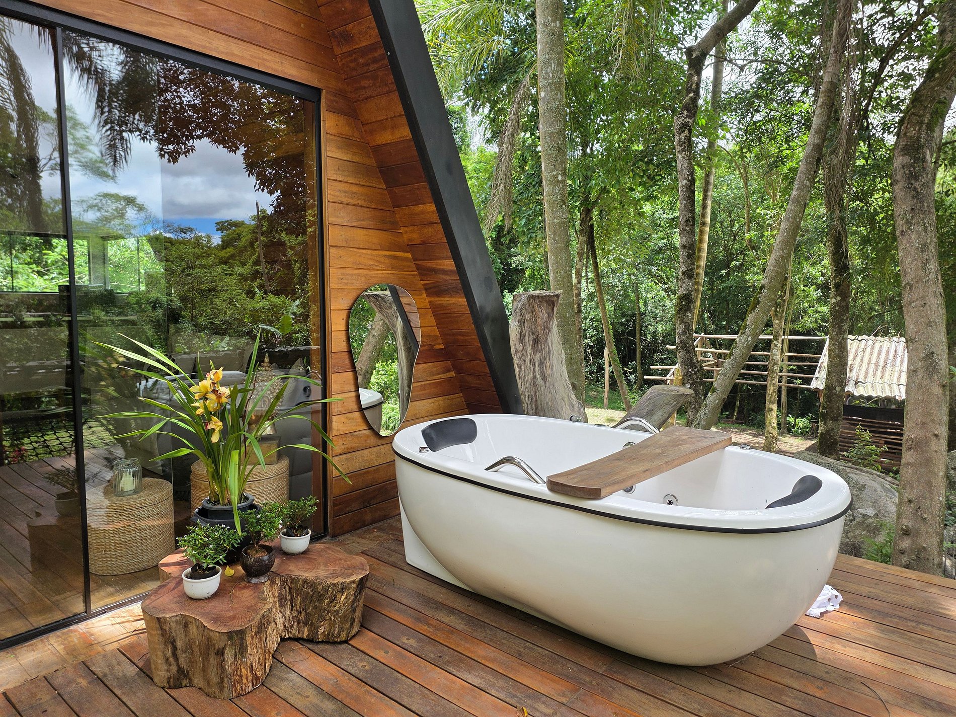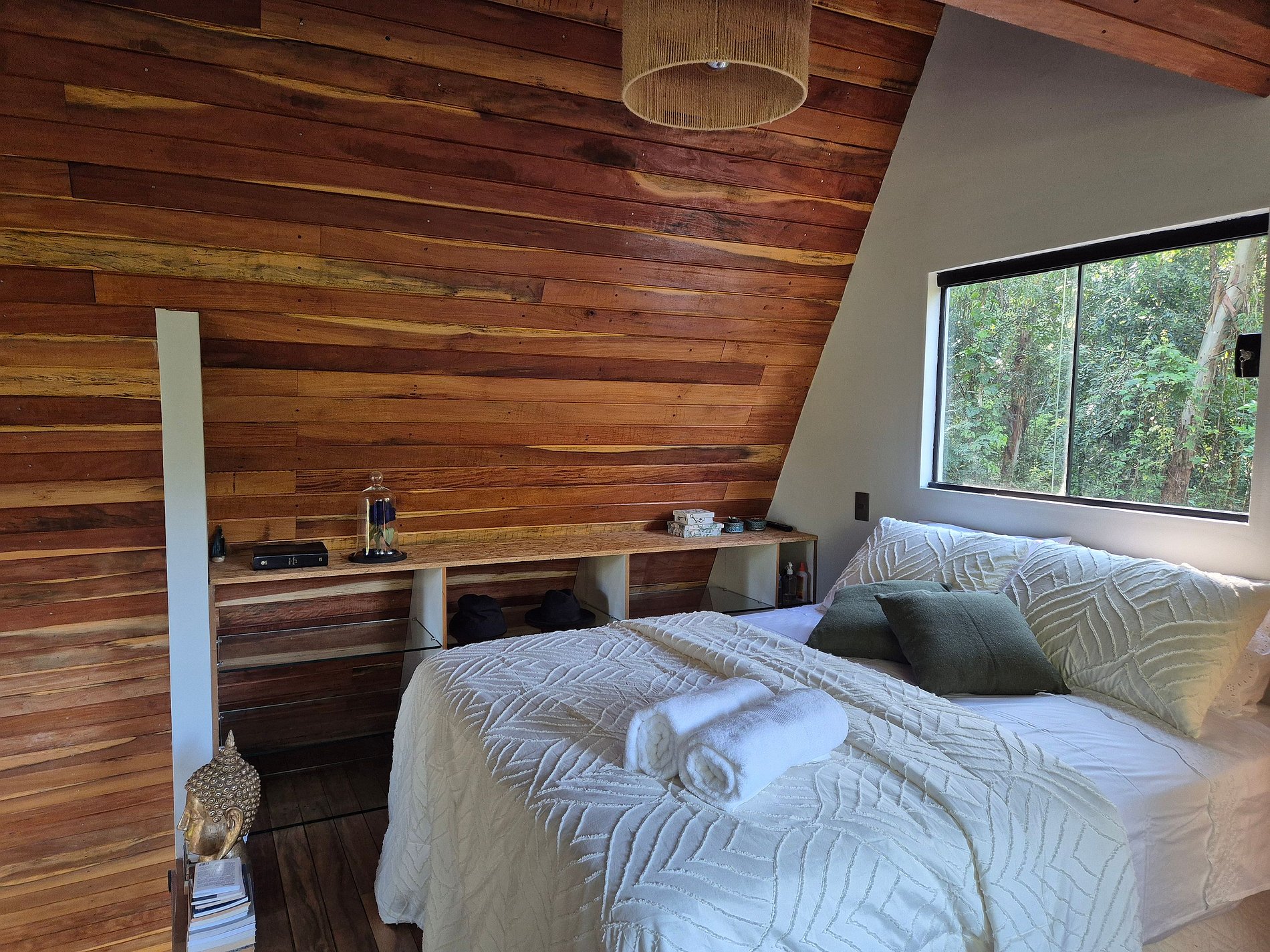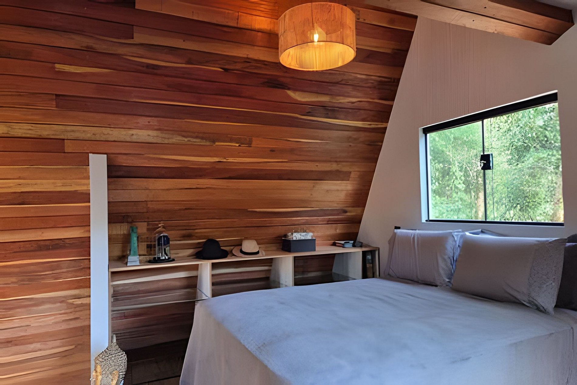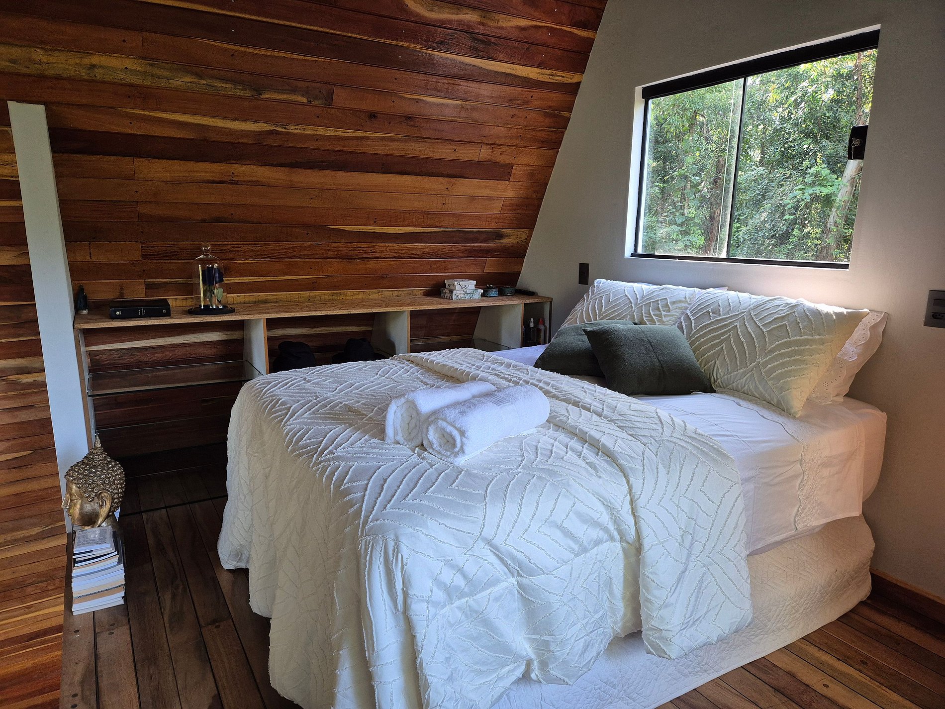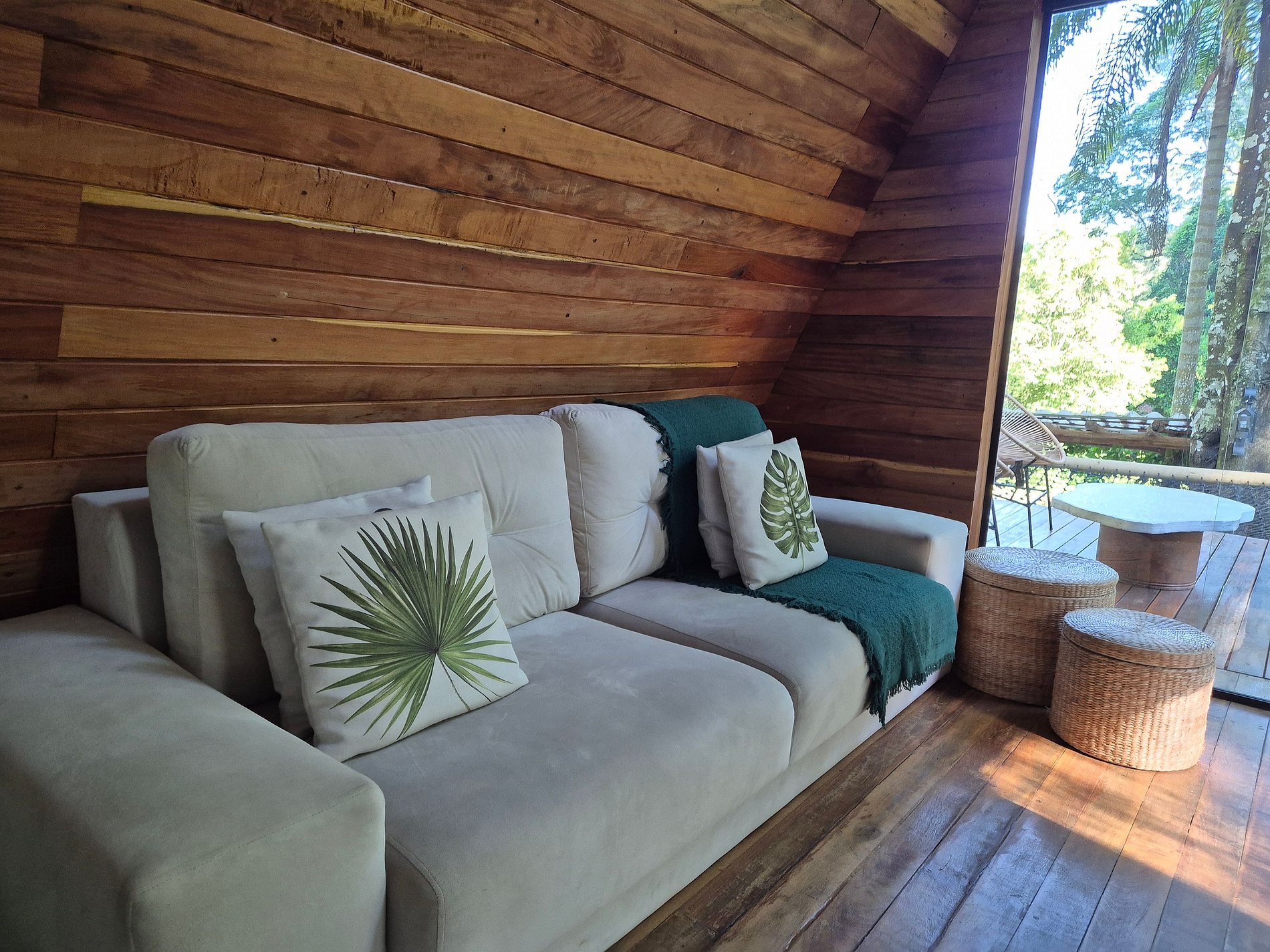 O chalé é elegante, acolhedor e funcional, contando com deck, sala integrada à cozinha, banheiro completo e um mezanino com uma confortável cama queen.