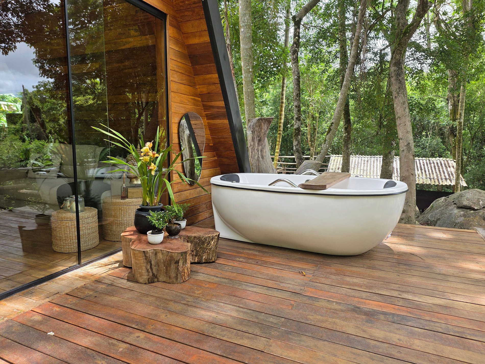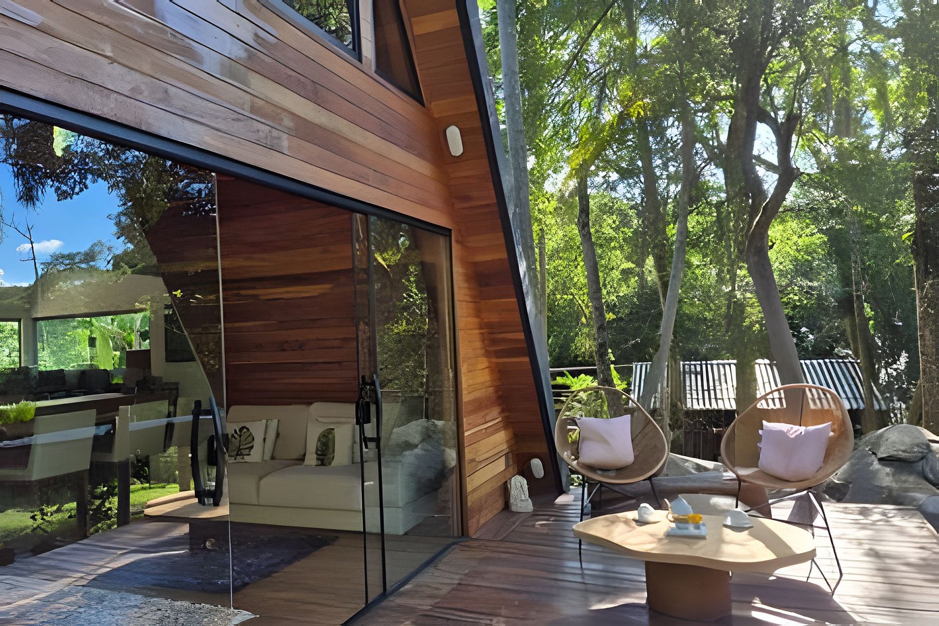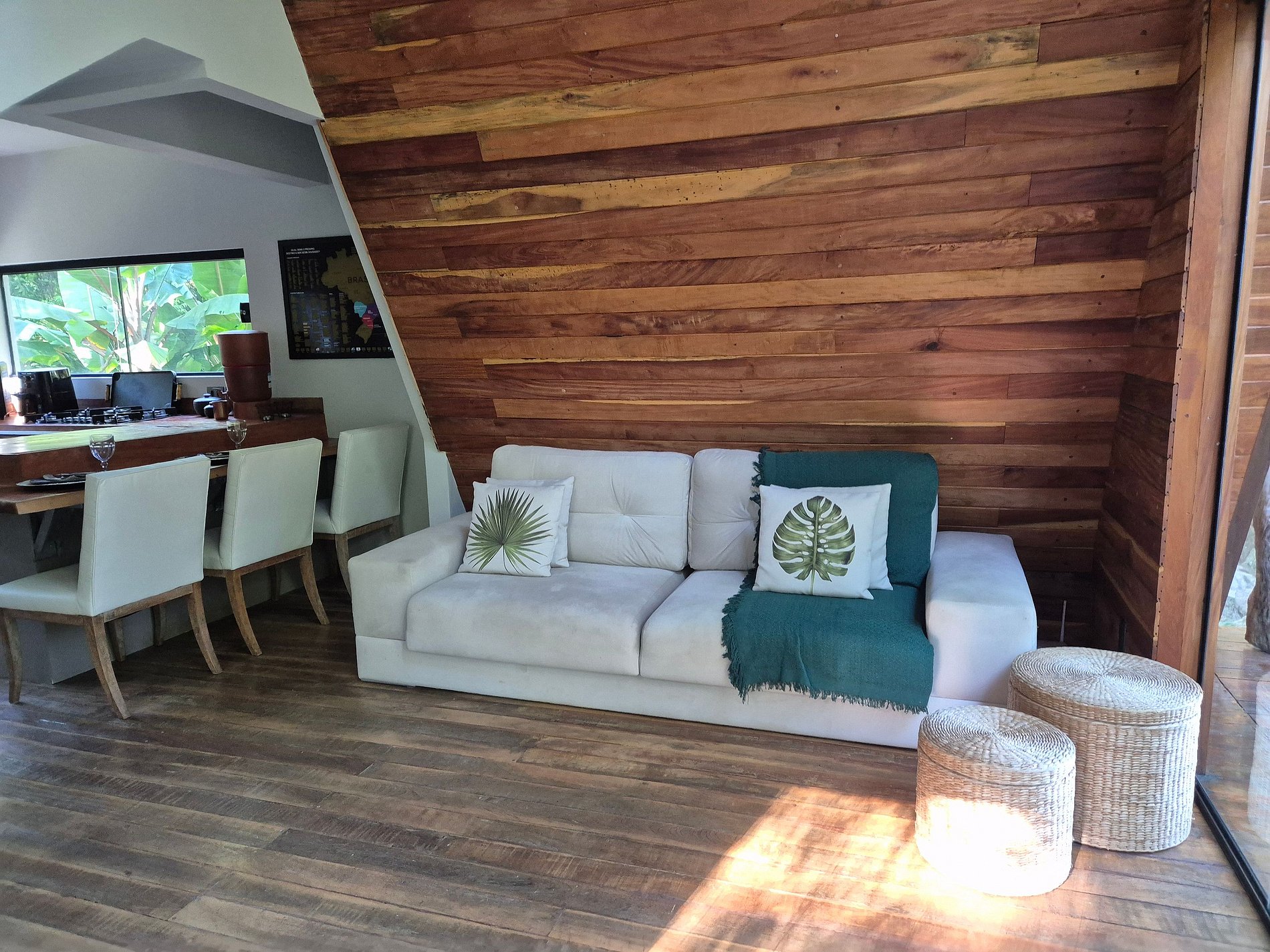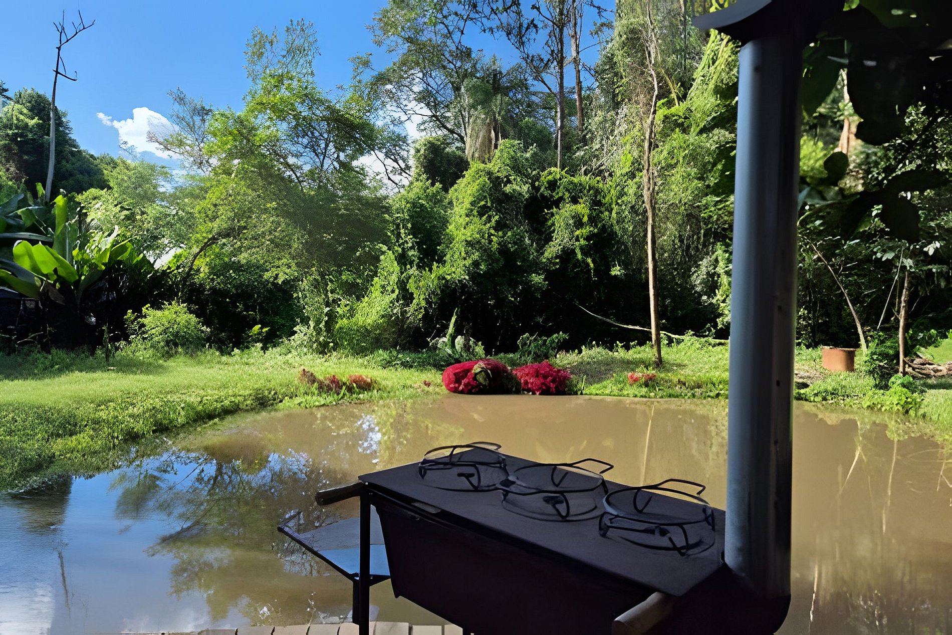 O chalé é elegante, acolhedor e funcional, contando com deck, sala integrada à cozinha, banheiro completo e um mezanino com uma confortável cama queen.