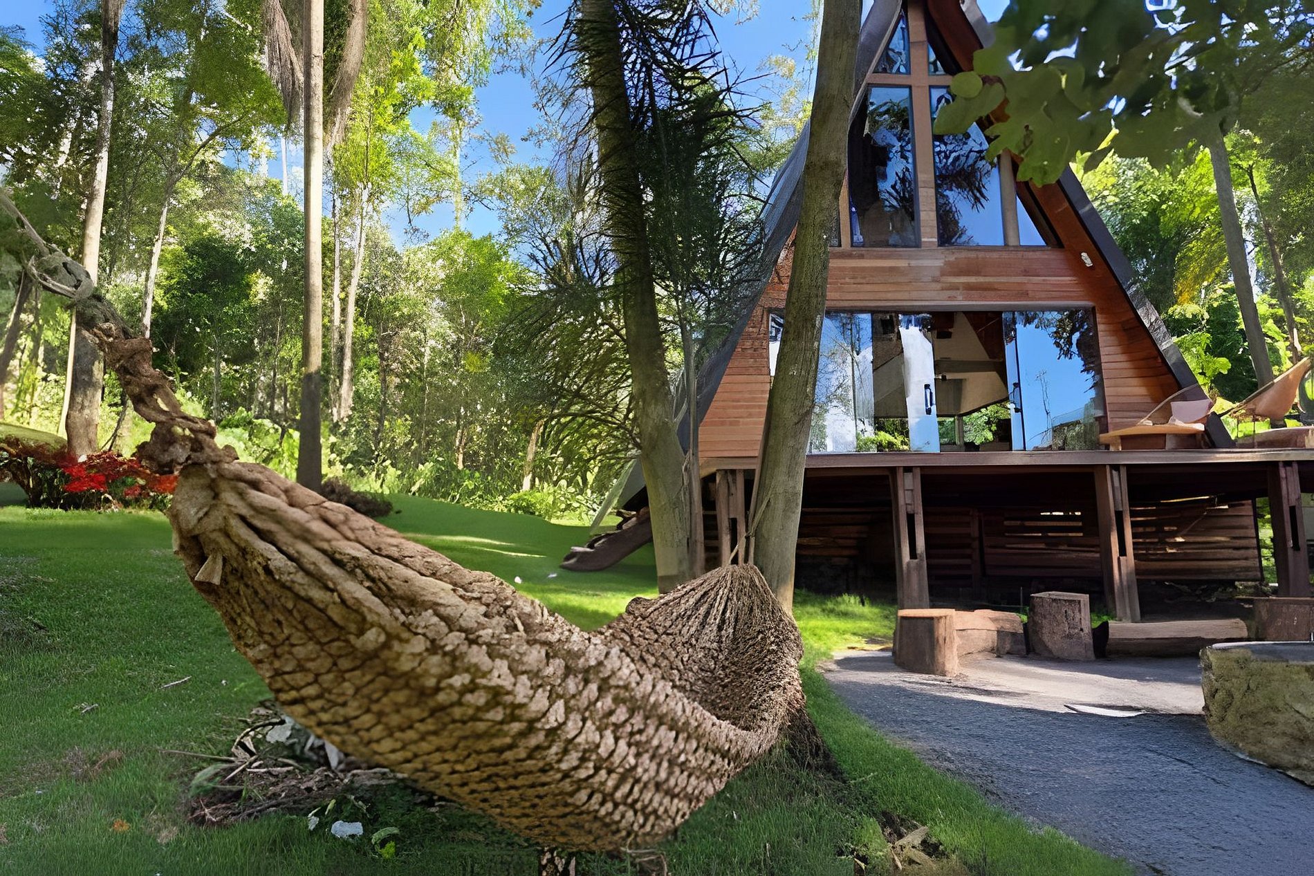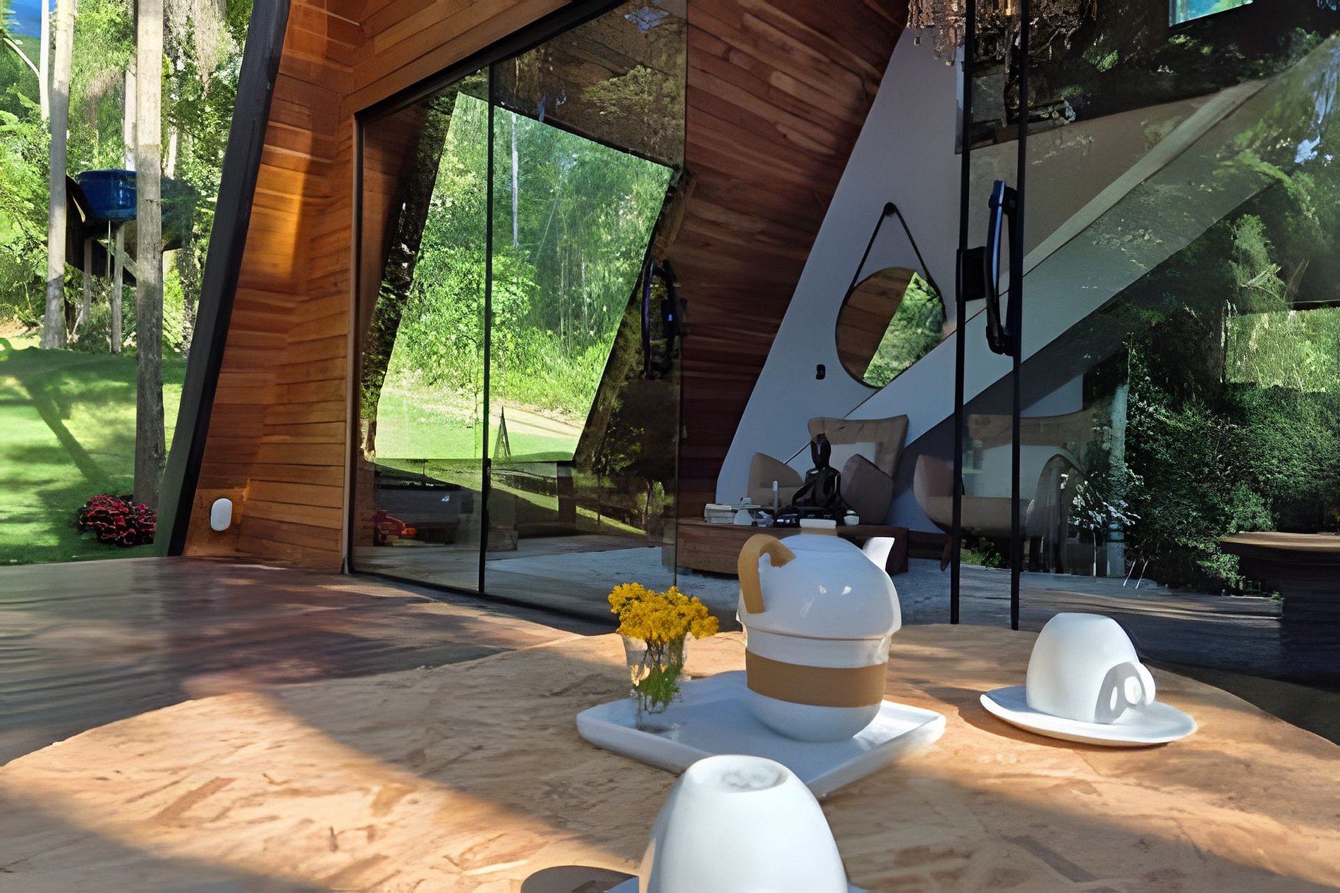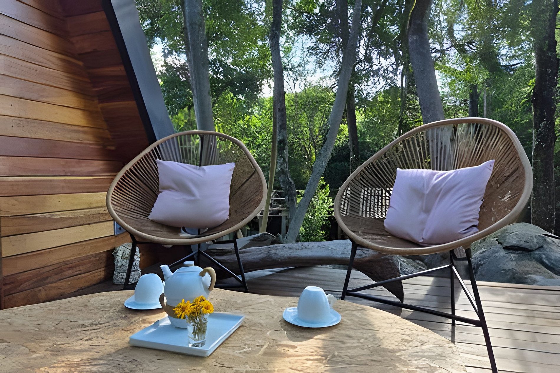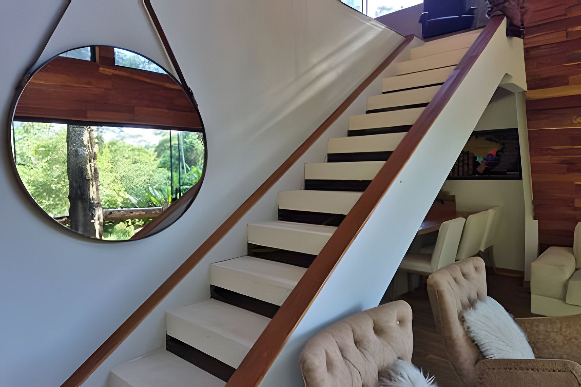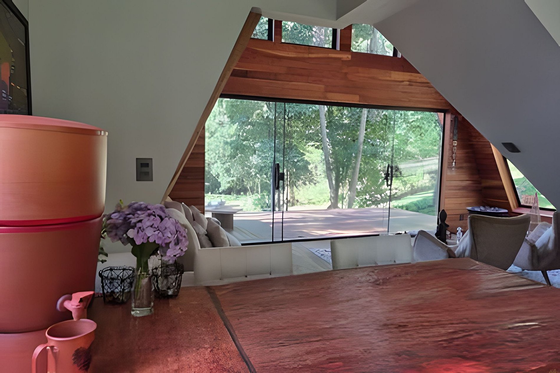 O chalé é elegante, acolhedor e funcional, contando com deck, sala integrada à cozinha, banheiro completo e um mezanino com uma confortável cama queen.