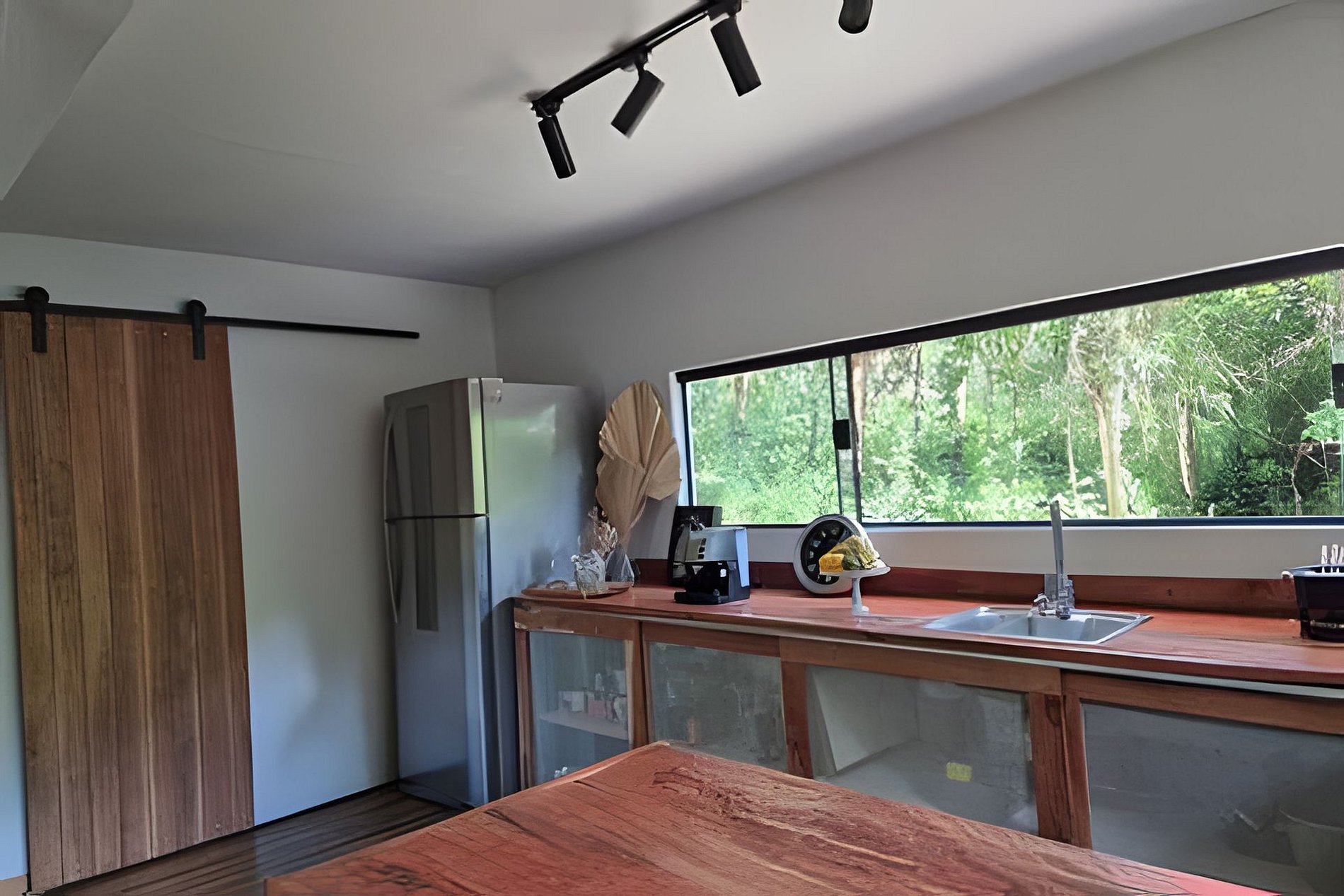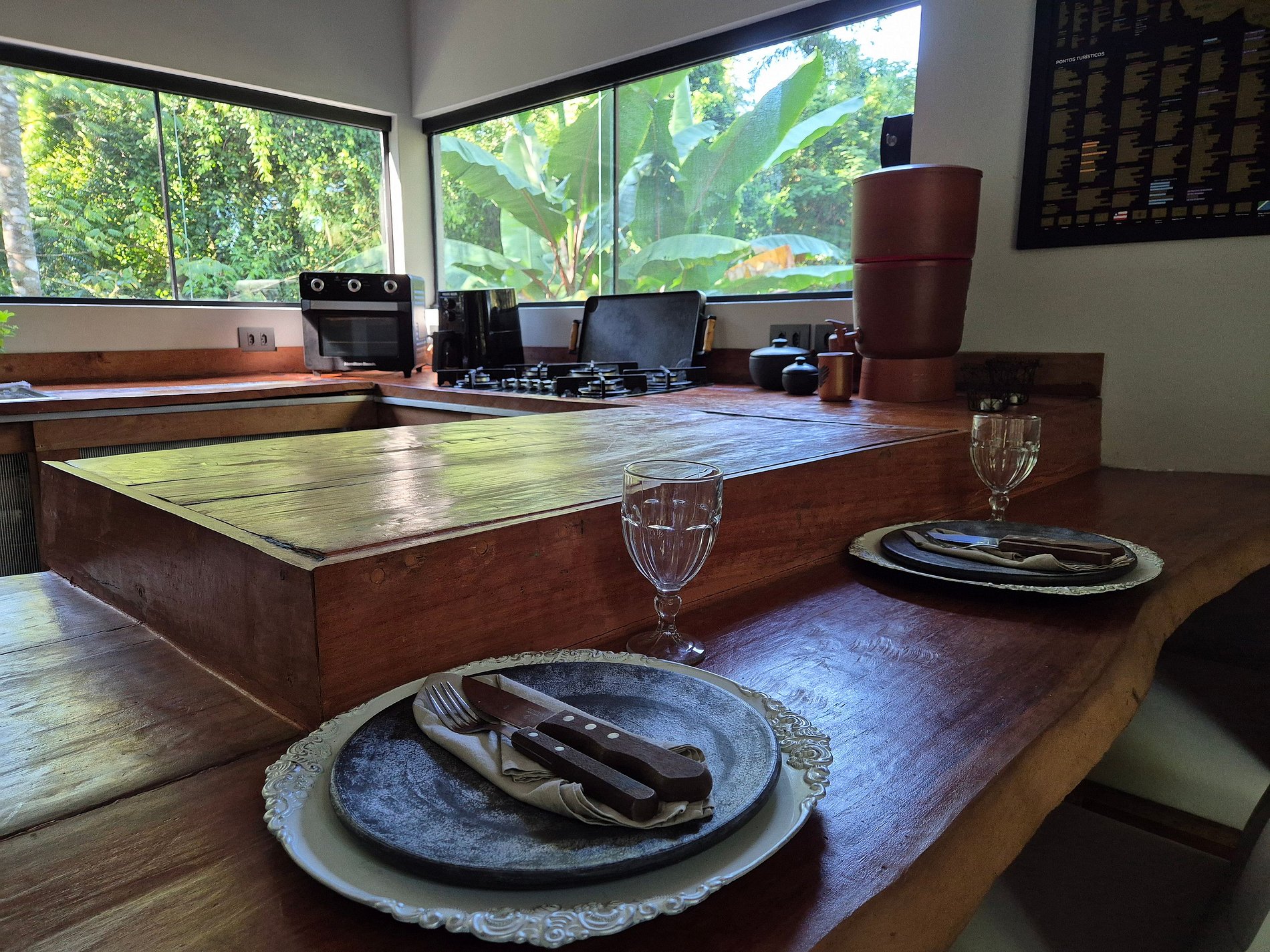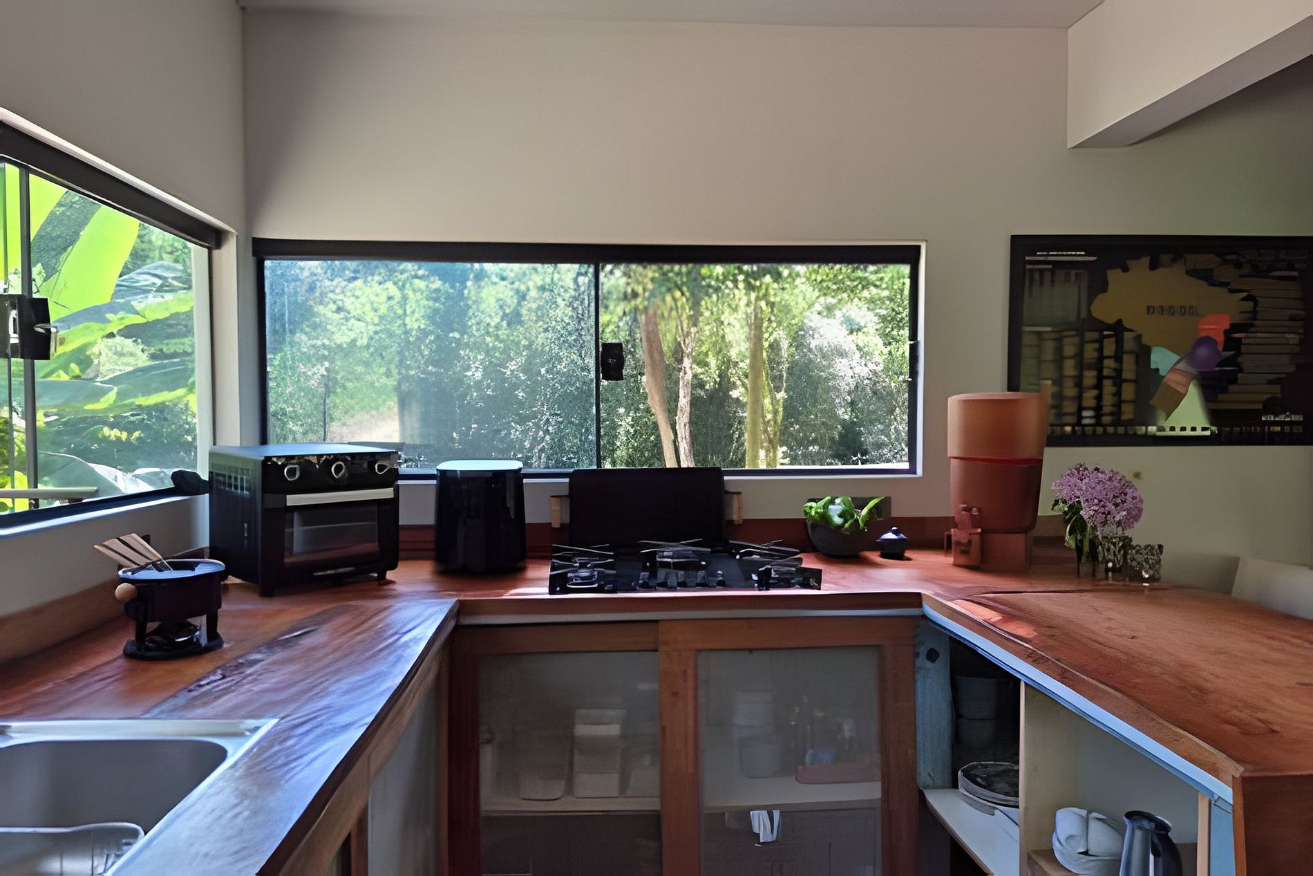 Mezanino - com uma cama queen e armário Sala com lareira ecológica, sofa, poltronas Banheiro completo Cozinha completa Area gourmet com mesa de jantar e churrasqueira Redário no jardim e Fogo de chão para aproveitar as noites frias e contemplar o céu estrelado.