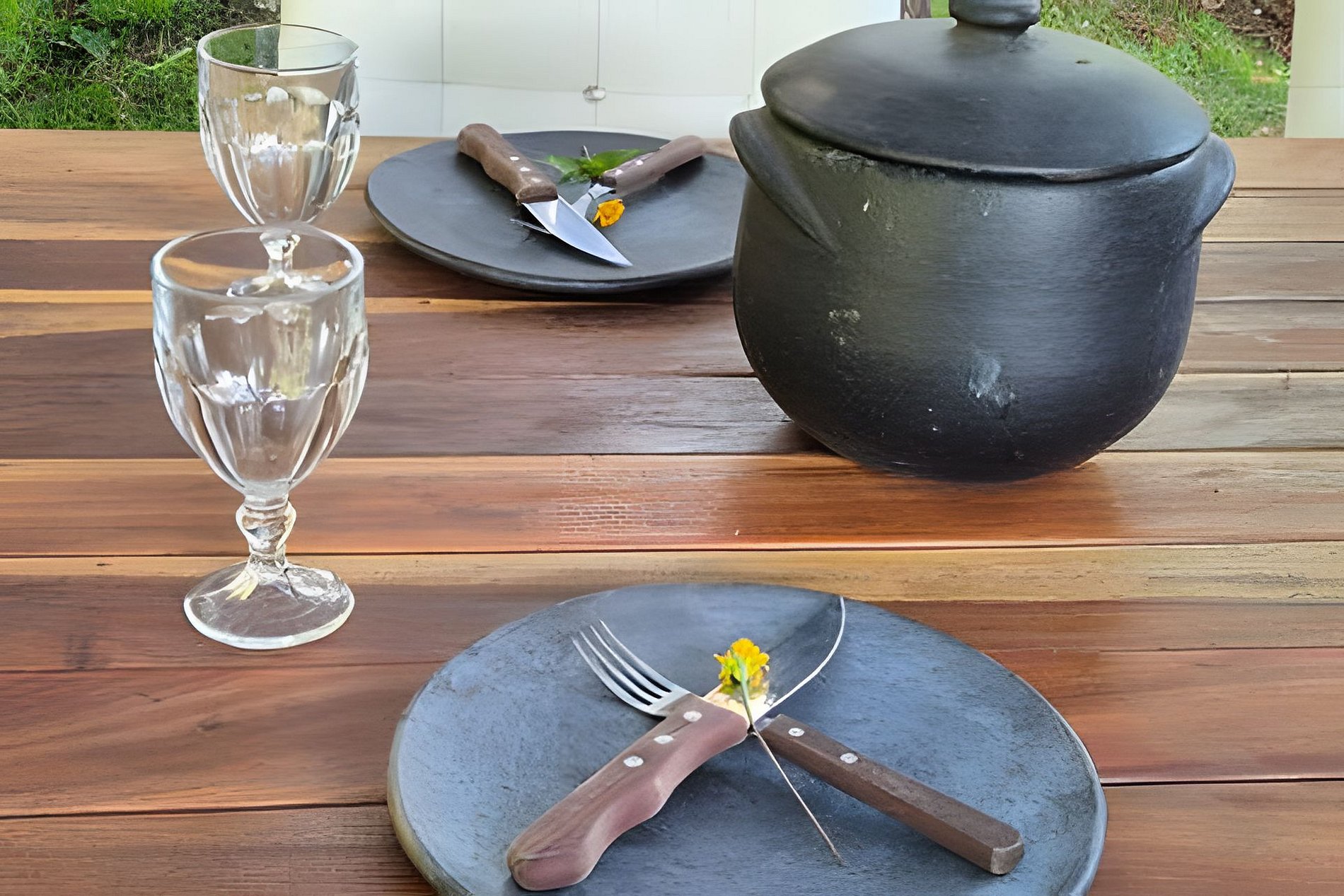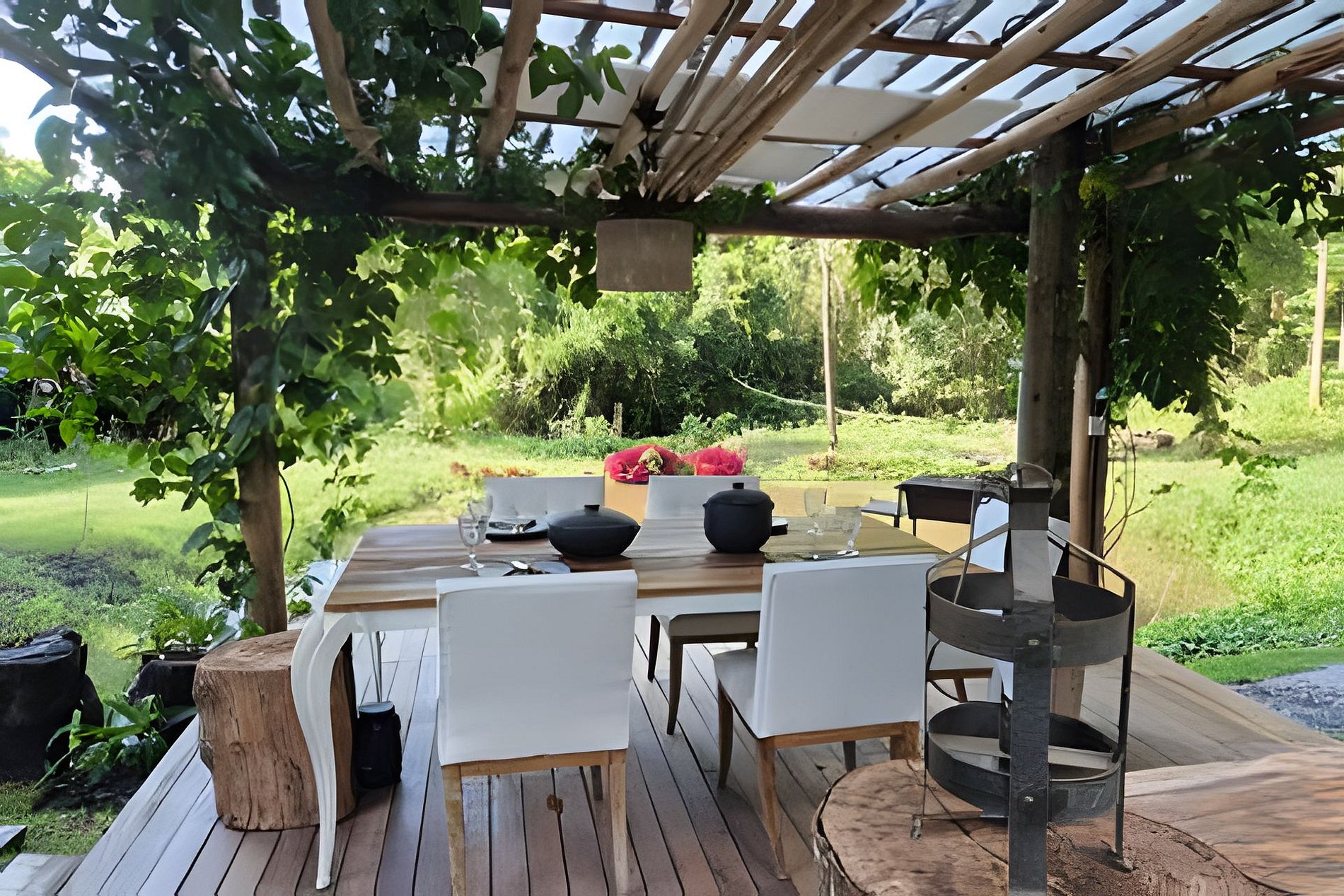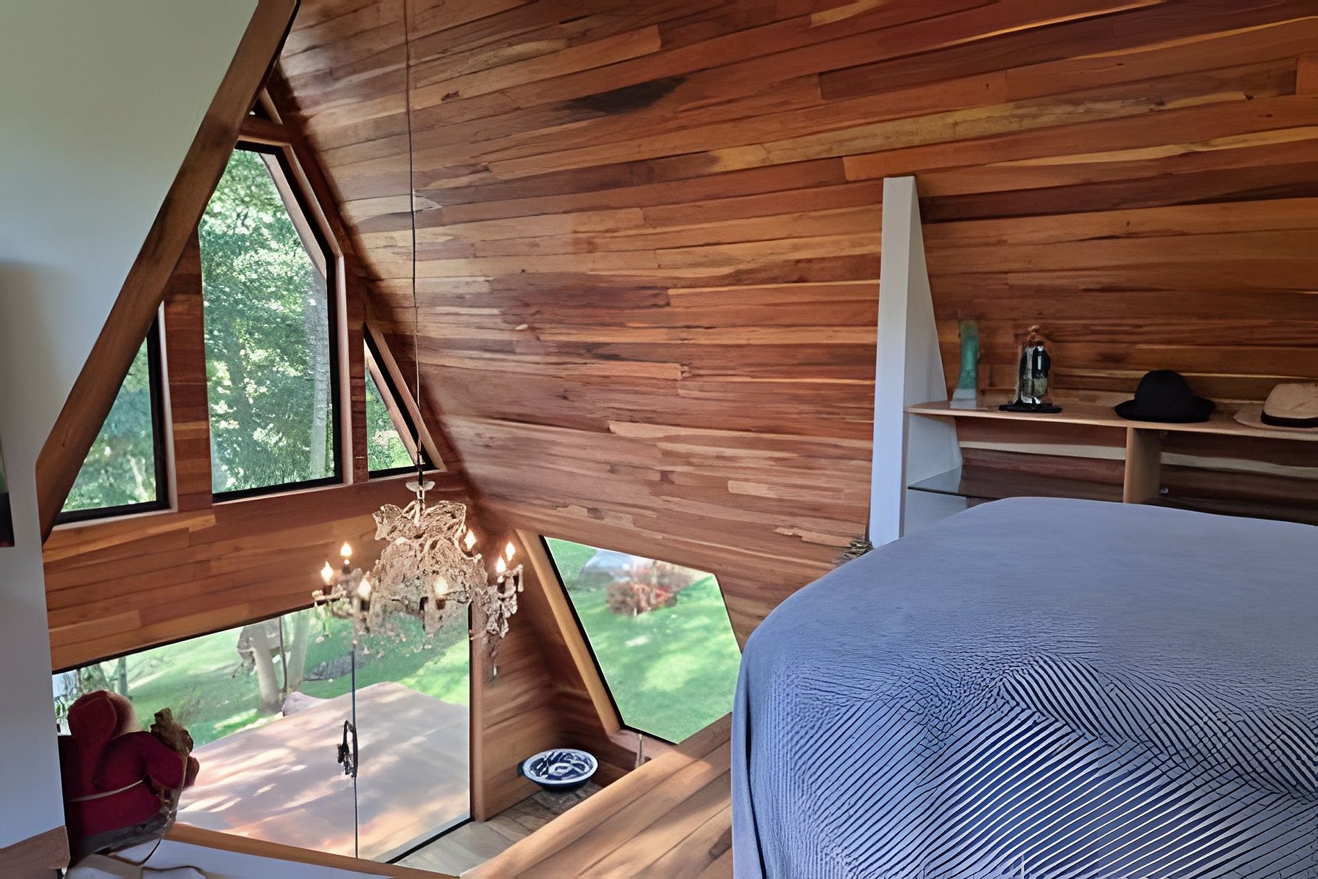 Mezanino - com uma cama queen e armário Sala com lareira ecológica, sofa, poltronas Banheiro completo Cozinha completa Area gourmet com mesa de jantar e churrasqueira Redário no jardim e Fogo de chão para aproveitar as noites frias e contemplar o céu estrelado.