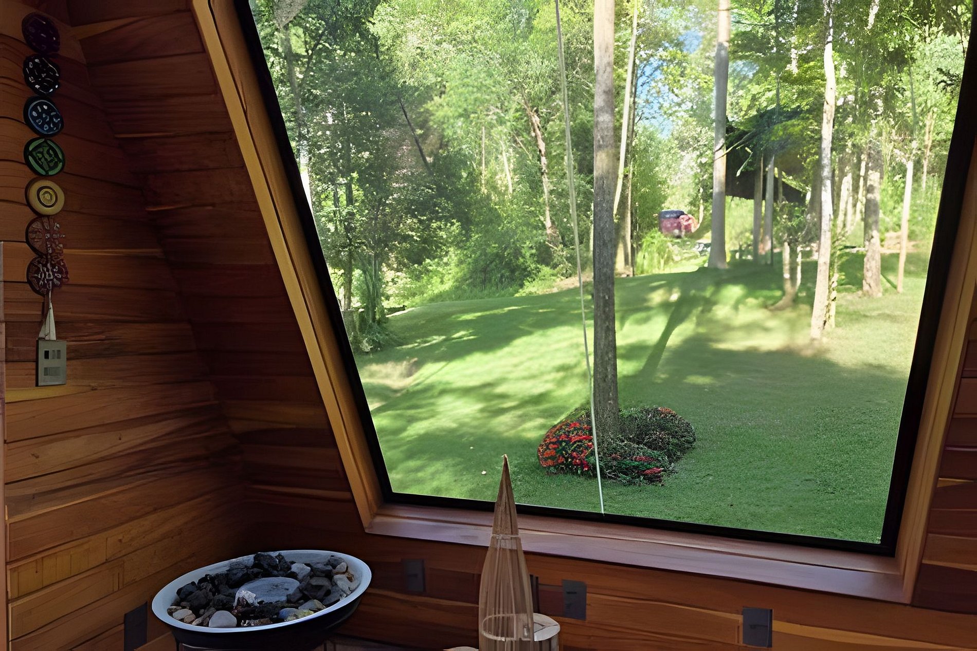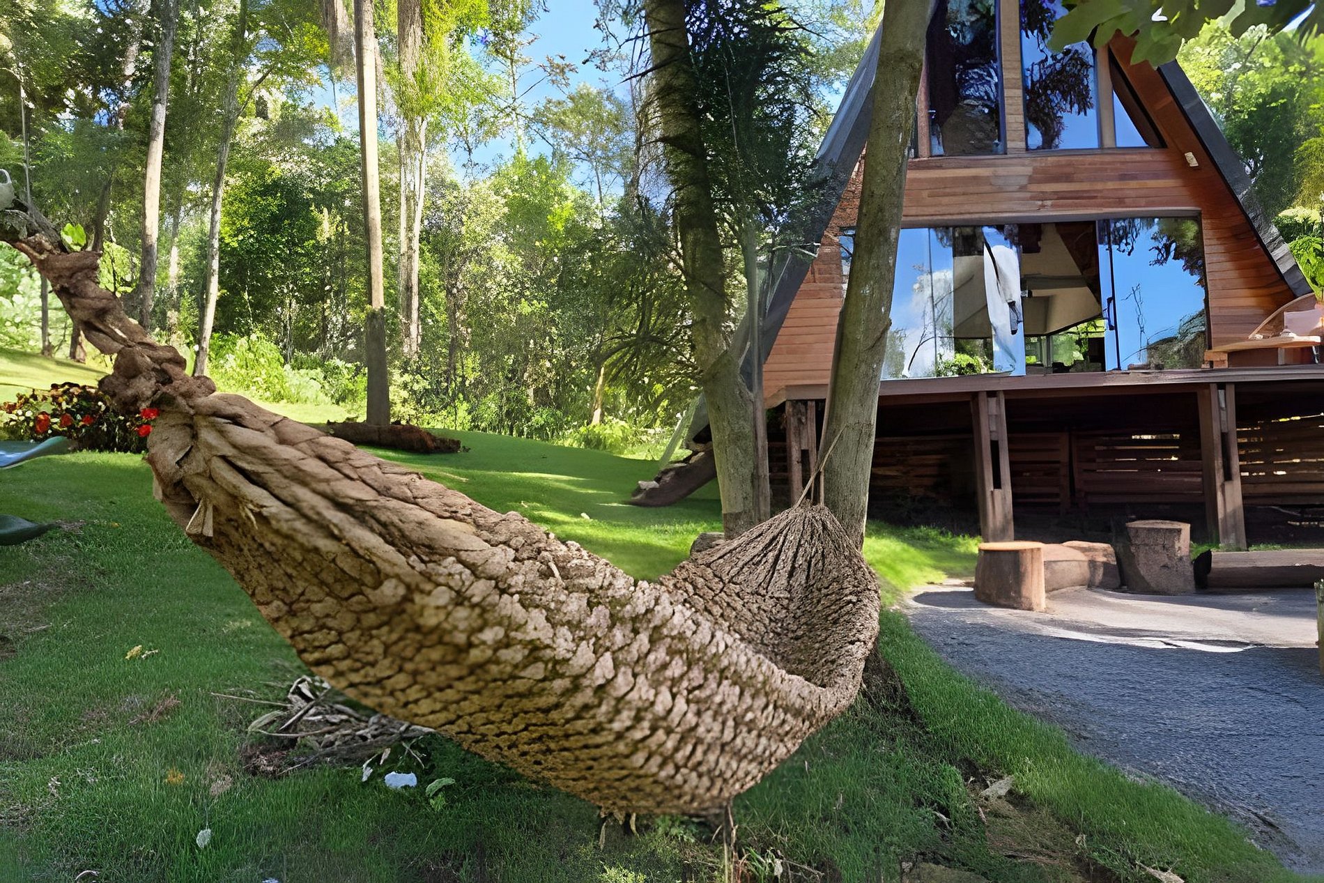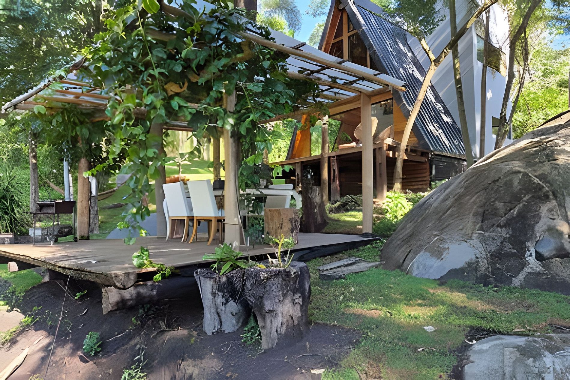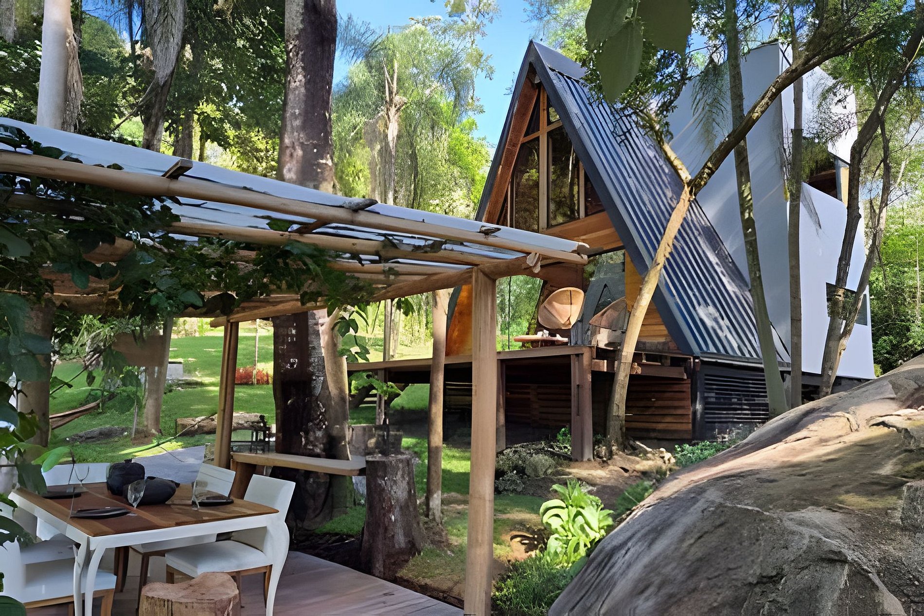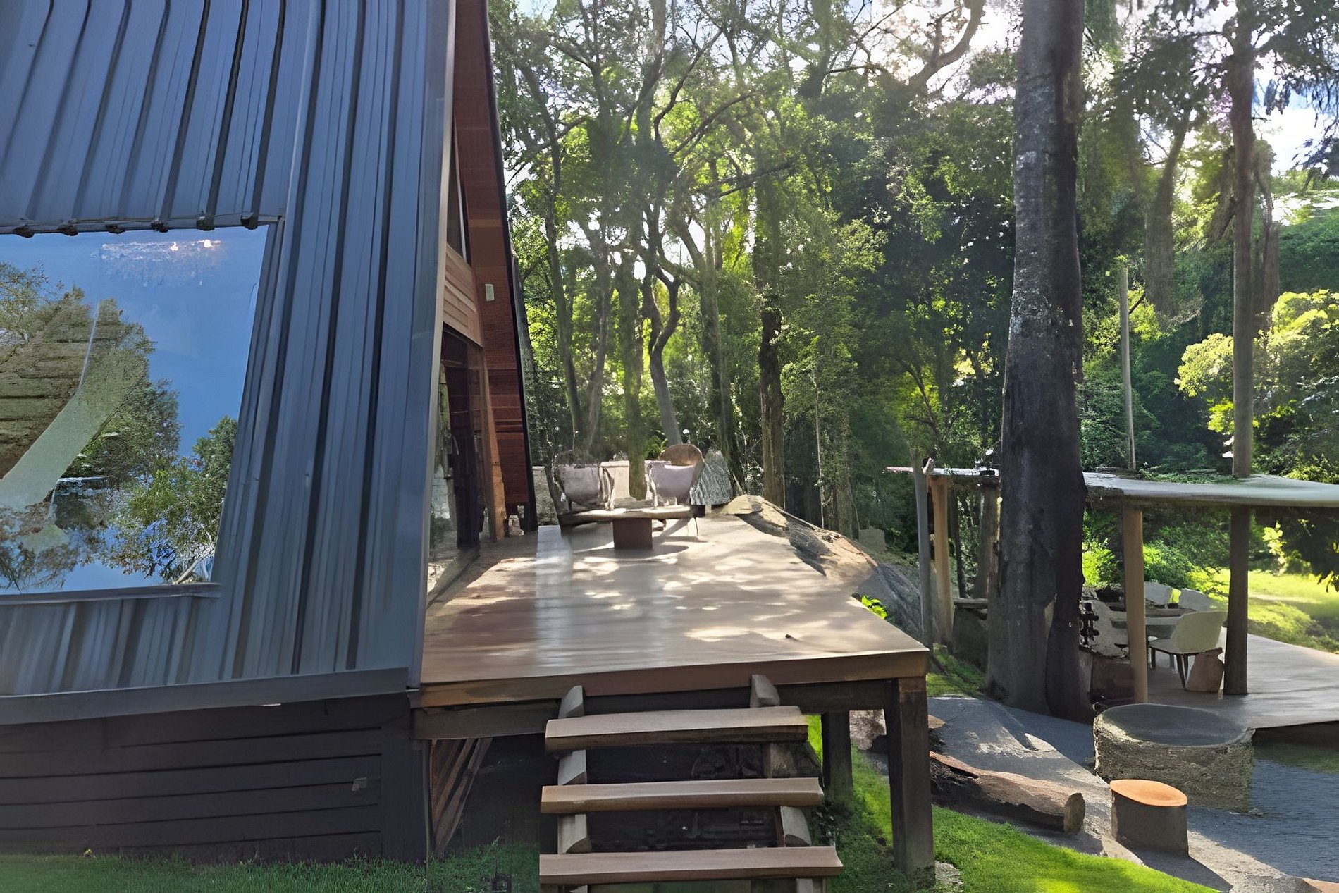 BOSQUE: um pequeno bosque complementa a área verde deste chalé
