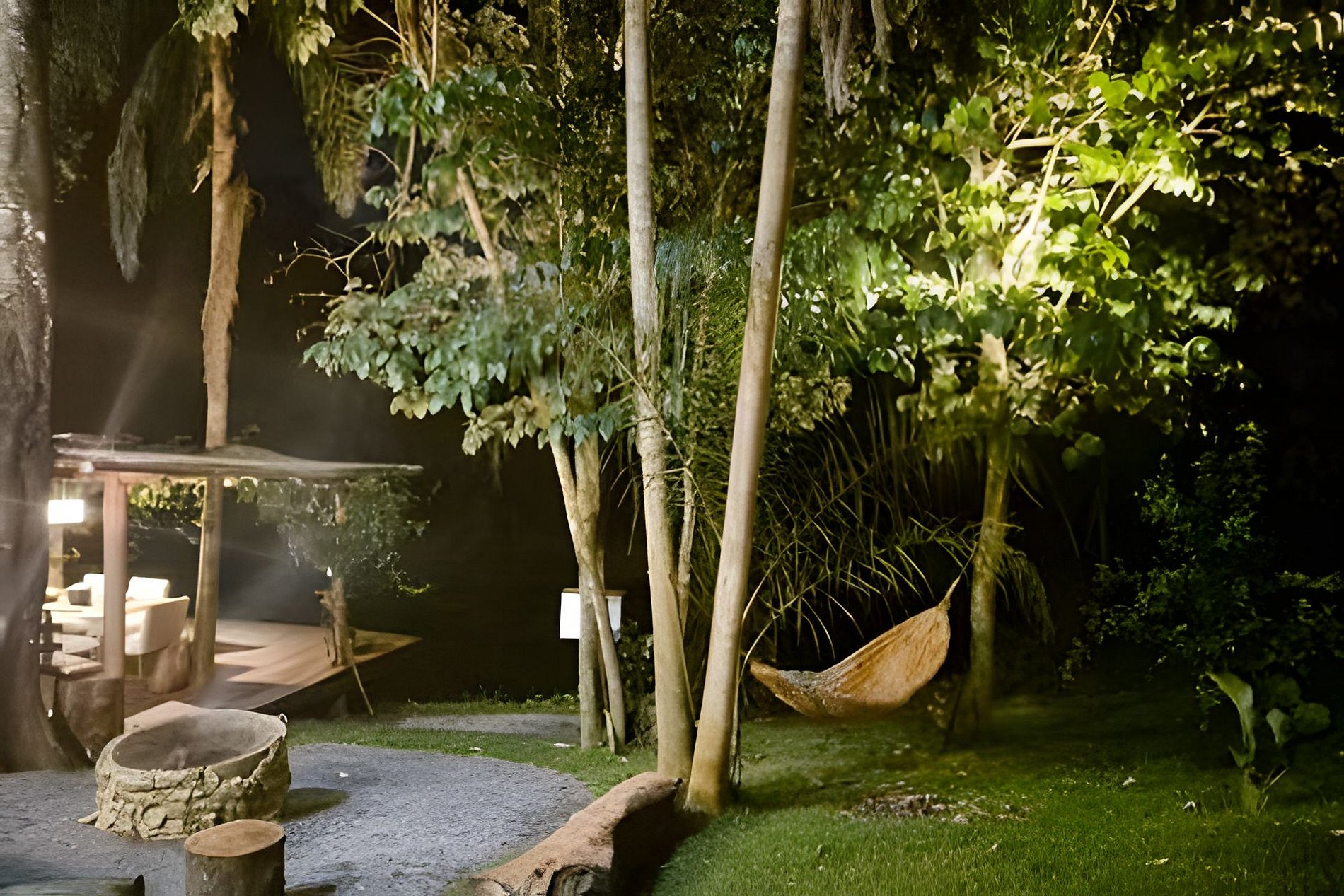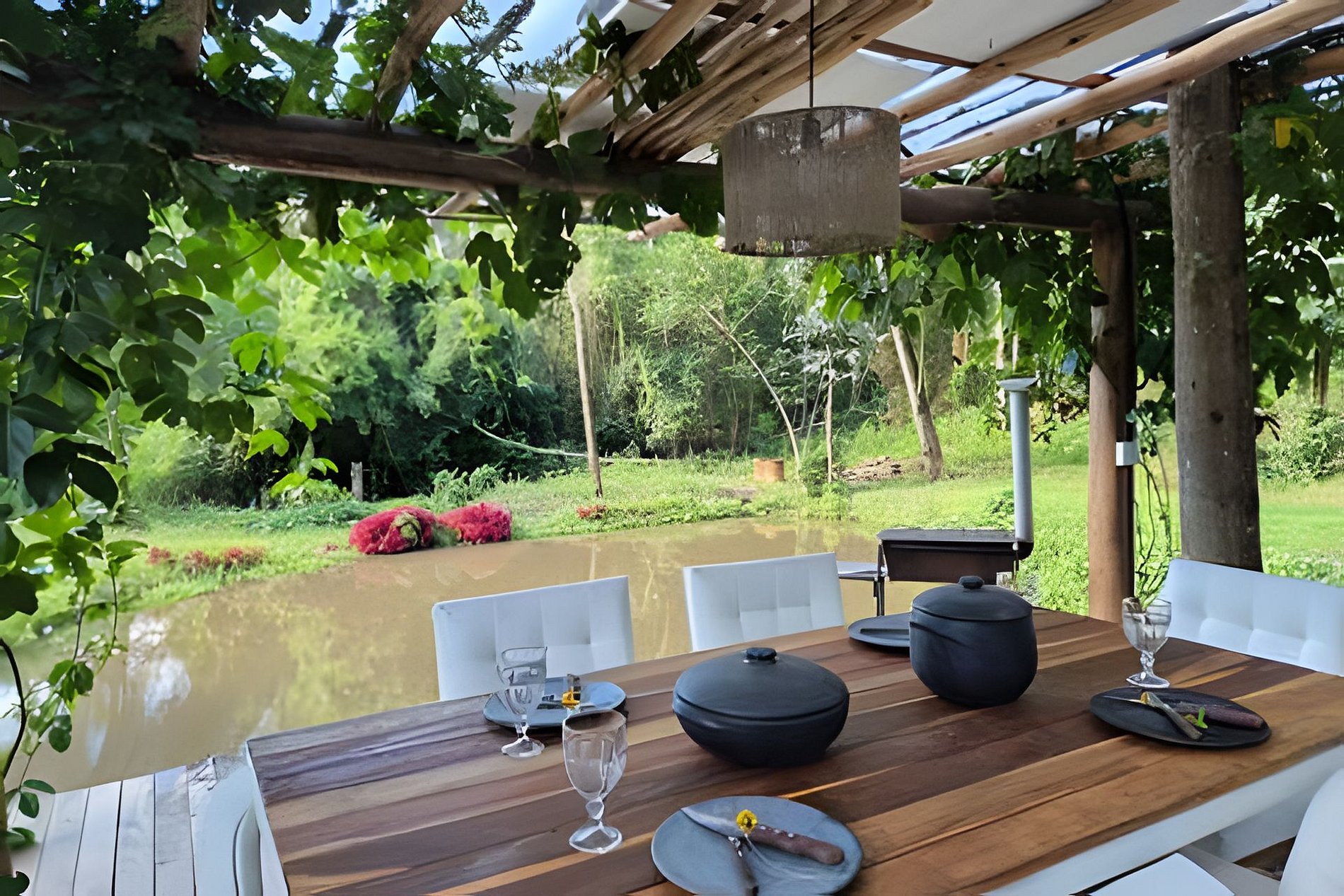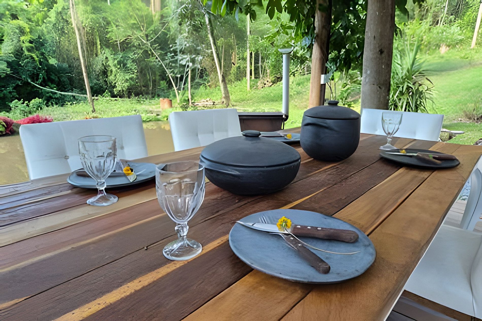 Do lado de fora, uma área gourmet equipada com churrasqueira, balcão, fogo de chão e espaço para rede convida ao lazer e ao descanso.