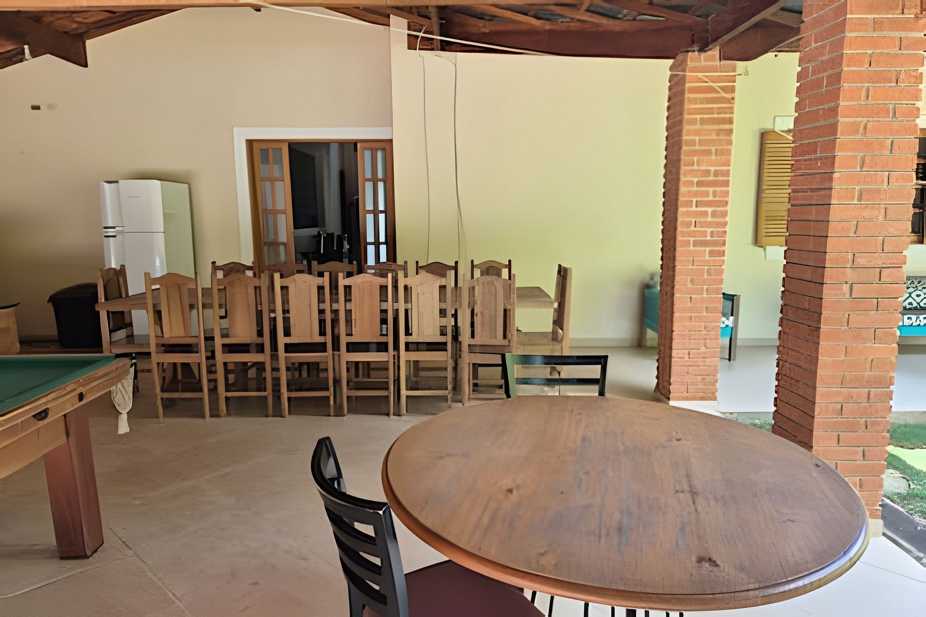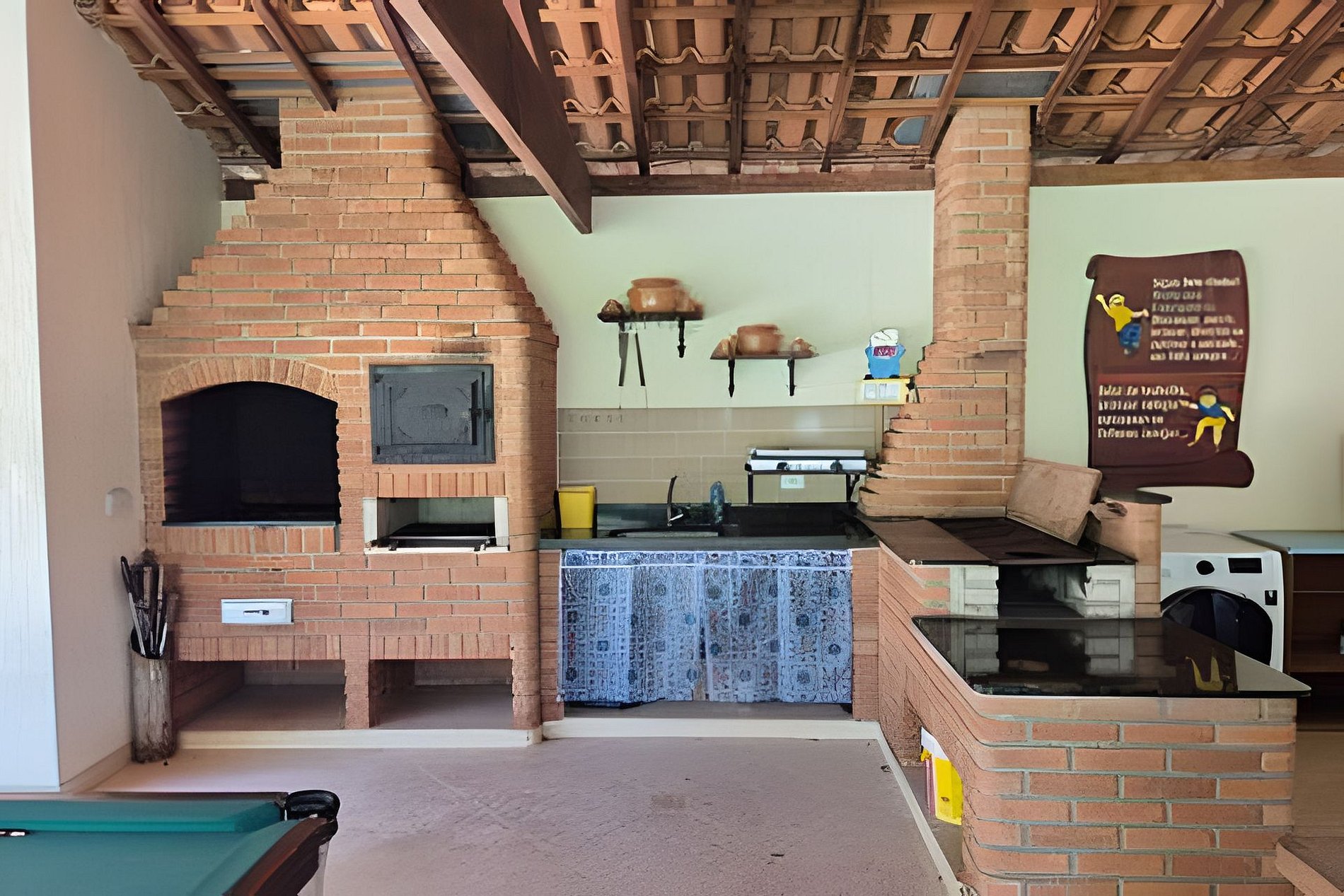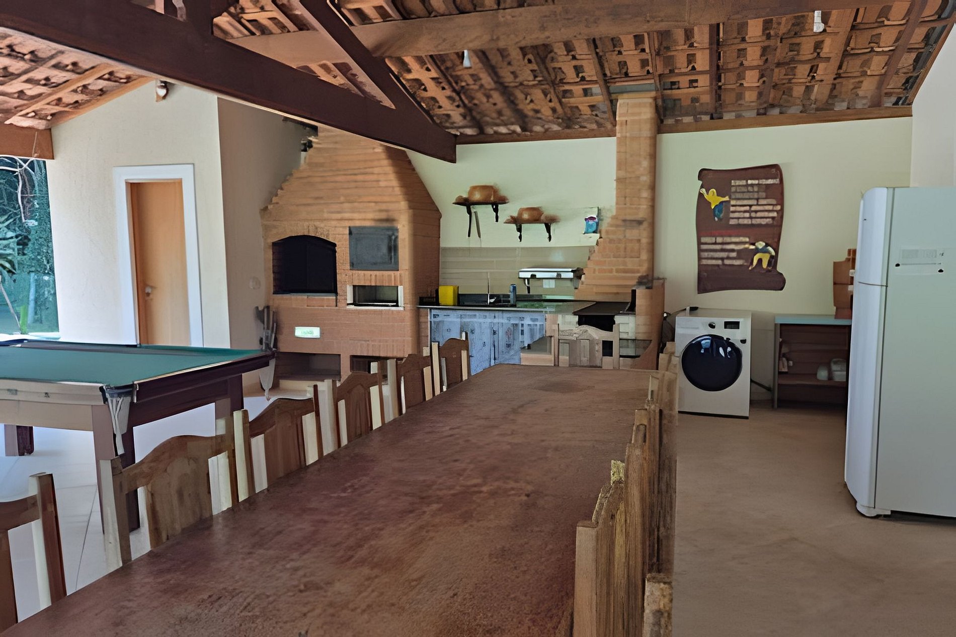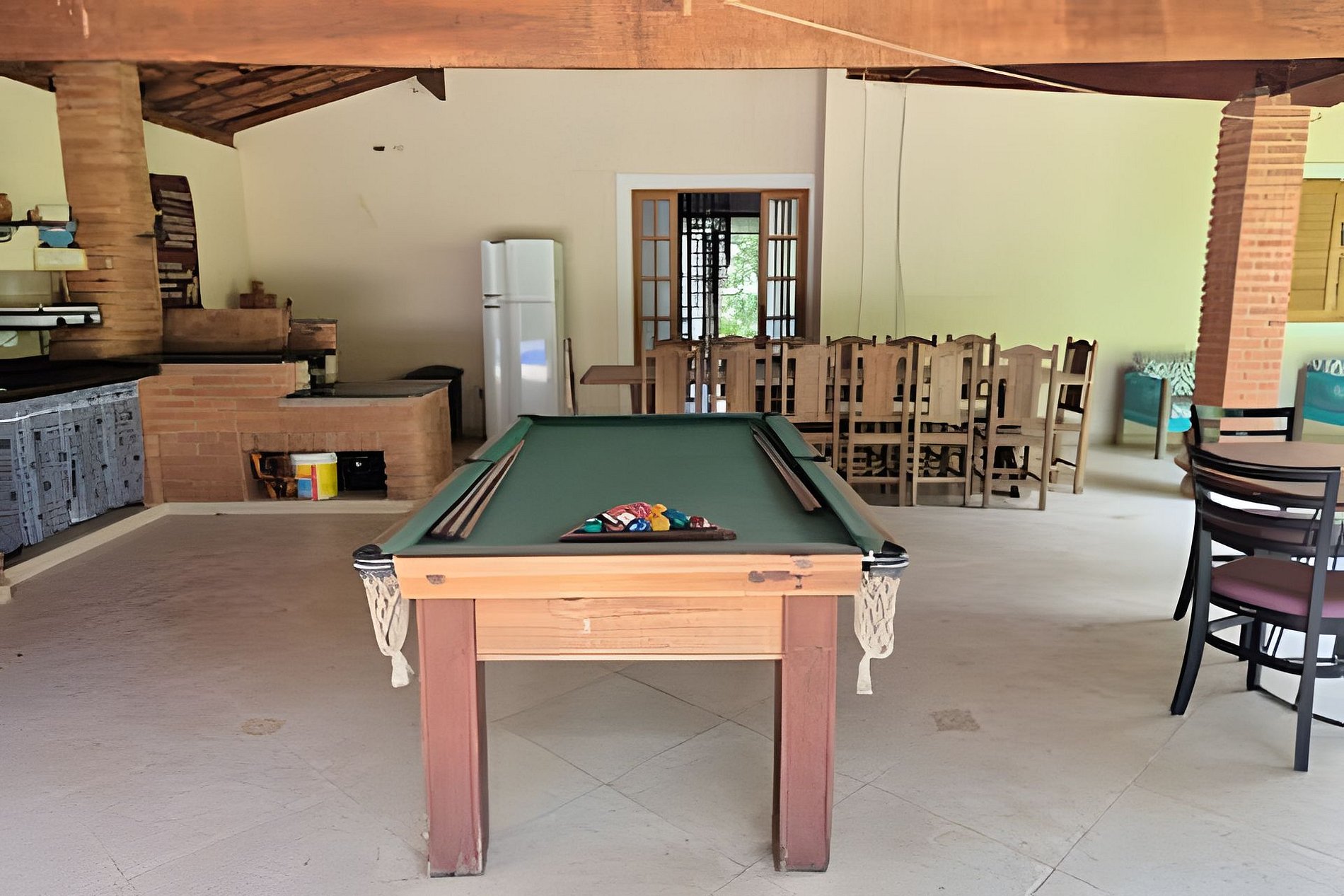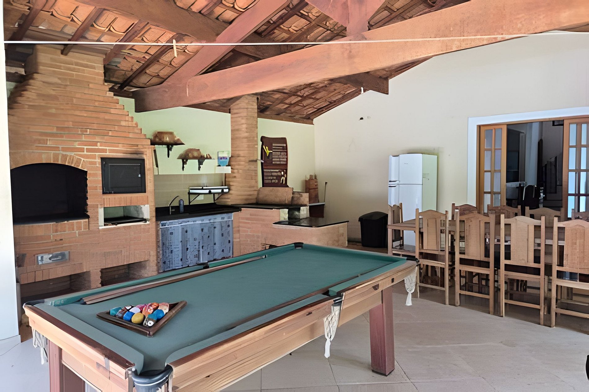 Area gourmet com mesa de jantar, forno, churrasqueira, fogão a lenha e geladeira Mesa de bilhar